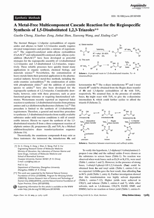 Angewandte Chemie International Edition是国际化学界顶级的杂志之一,其影响因子一直雄踞榜首(今年为13.734);其中,程国林老师为第一作者,崔秀灵教授为通讯作者,研究生沈金海、王雪松、曾小宝为共同作者。该研究巧妙地通过适当碱的调节,使胺和炔酮发生Michael加成反应、脱酰化、重氮基转移、环化等串联反应,高效、高区域选择性“一锅”合成了系列1,5-取代三氮唑衍生物。该合成方法简单、实用、绿色、高效、高选择性,可广泛地应用于含有1,5-取代三氮唑的药物、生物传感器、功能性材料等的合成。